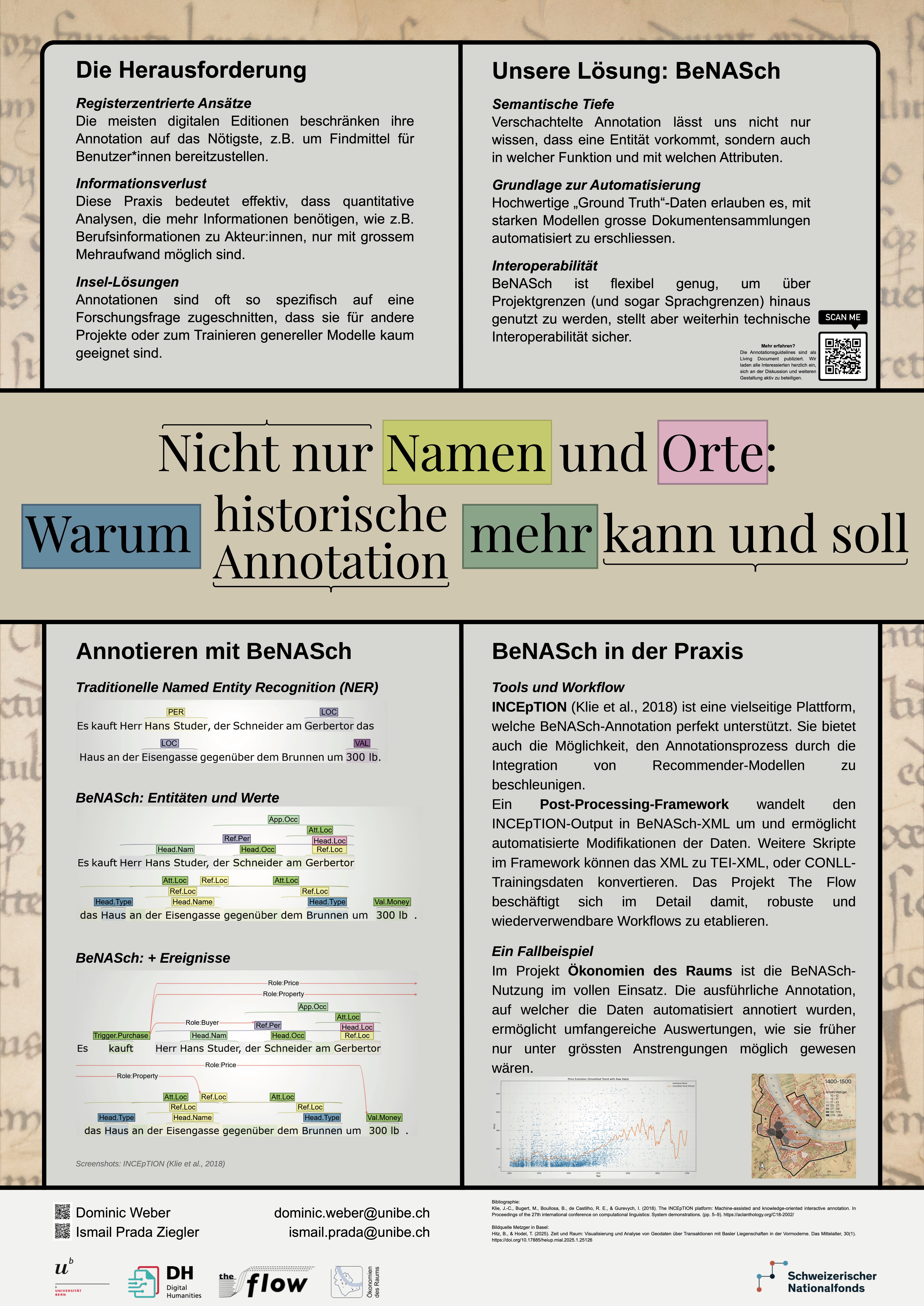 Das Poster argumentiert für reichhaltigere Annotationen in den Geschichtswissenschaften, die über minimale Registerzwecke hinausgehen. Vorgestellt wird das verschachtelte BeNASch-Schema, das Referenzen, beschreibende Elemente und Werte systematisch erfasst und dadurch Beziehungen und Ereignisse ableitbar macht. Mit INCEpTION, Vorannotationen und Post-Processing-Skripten wird der Mehraufwand reduziert. Anwendungsbeispiele aus Ökonomien des Raums und The Flow zeigen, wie solche Annotationen neue Auswertungen ermöglichen und zugleich die Interoperabilität sowie das Training von KI-Modellen verbessern.